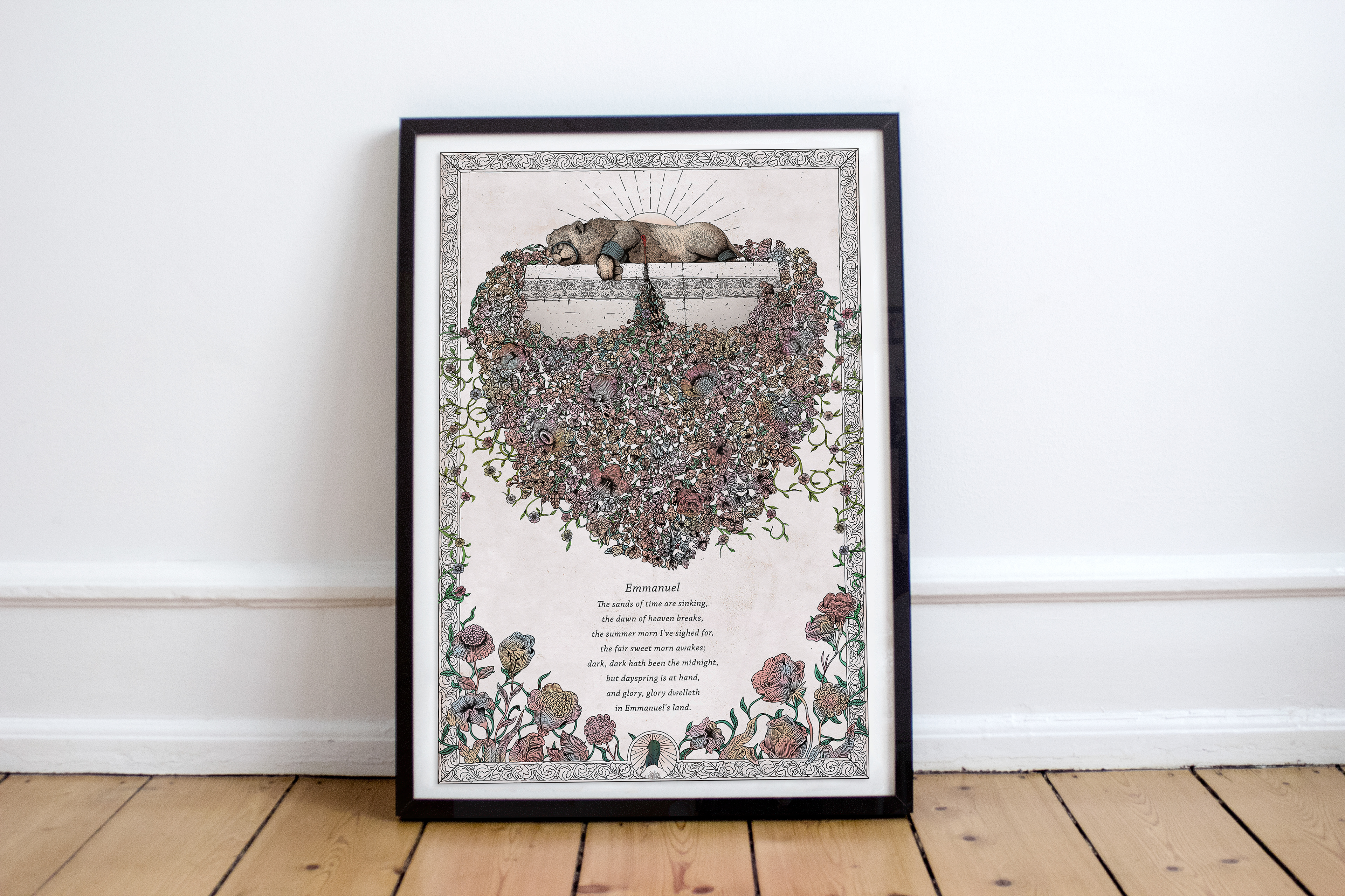 Inspired by the hymn 'The sands of time are sinking' the illustration shows Aslan's sacrifice with the new life that came from his death.
